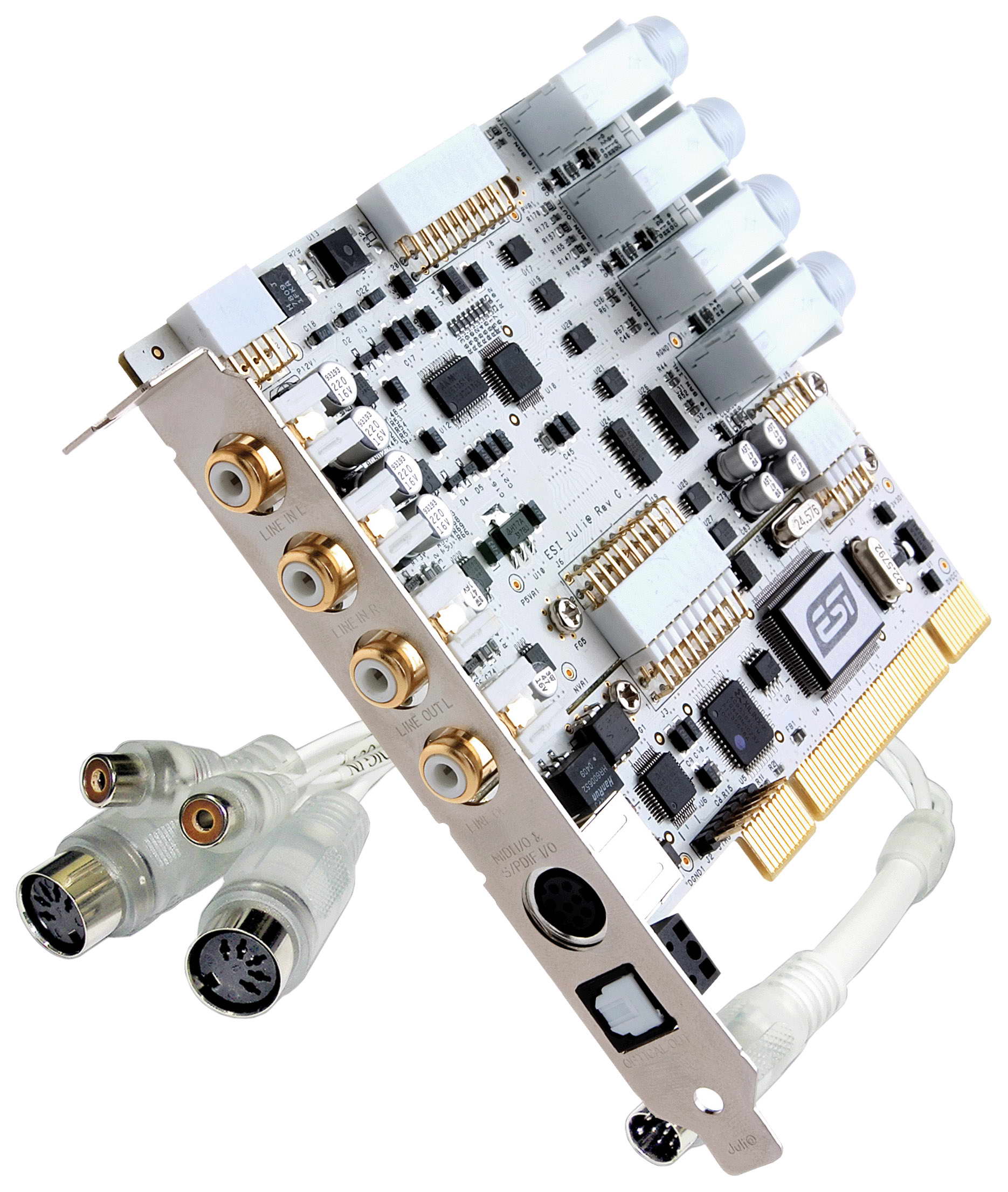 Juli@, PCI аудио/MIDI плата, имеющая 2 аналоговых входа и 2 аналоговых выхода. Juli@ обеспечивает разрешение сигнала 24 бита с частотой дискретизации 192 кГц, 16 MIDI каналов и цифровой интерфейс S/PDIF вход/выход.
