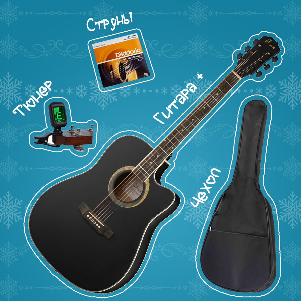 Новогодний комплект: акустическая гитара, чехол, тюнер для настройки гитары, качественные струны D'Addario (калибр на выбор 9-10-11)