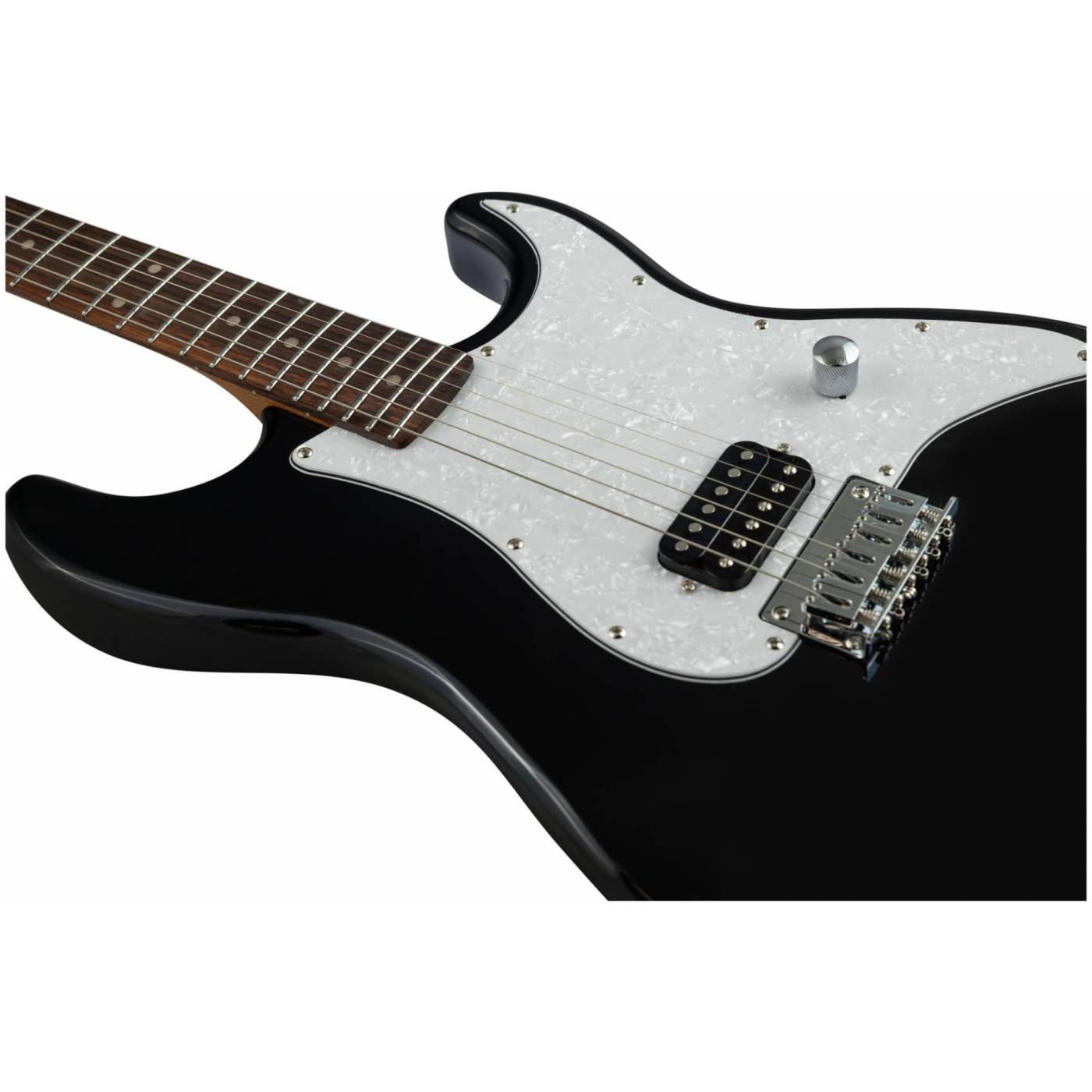 Накладка на гриф выполнена из палисандра, фурнитура хром, фиксированное тремоло, 1 хамбакер черного цвета, перламутровая накладка и металлическая ручка управления – в JET JS-400 HT BK все продумано до мелочей.