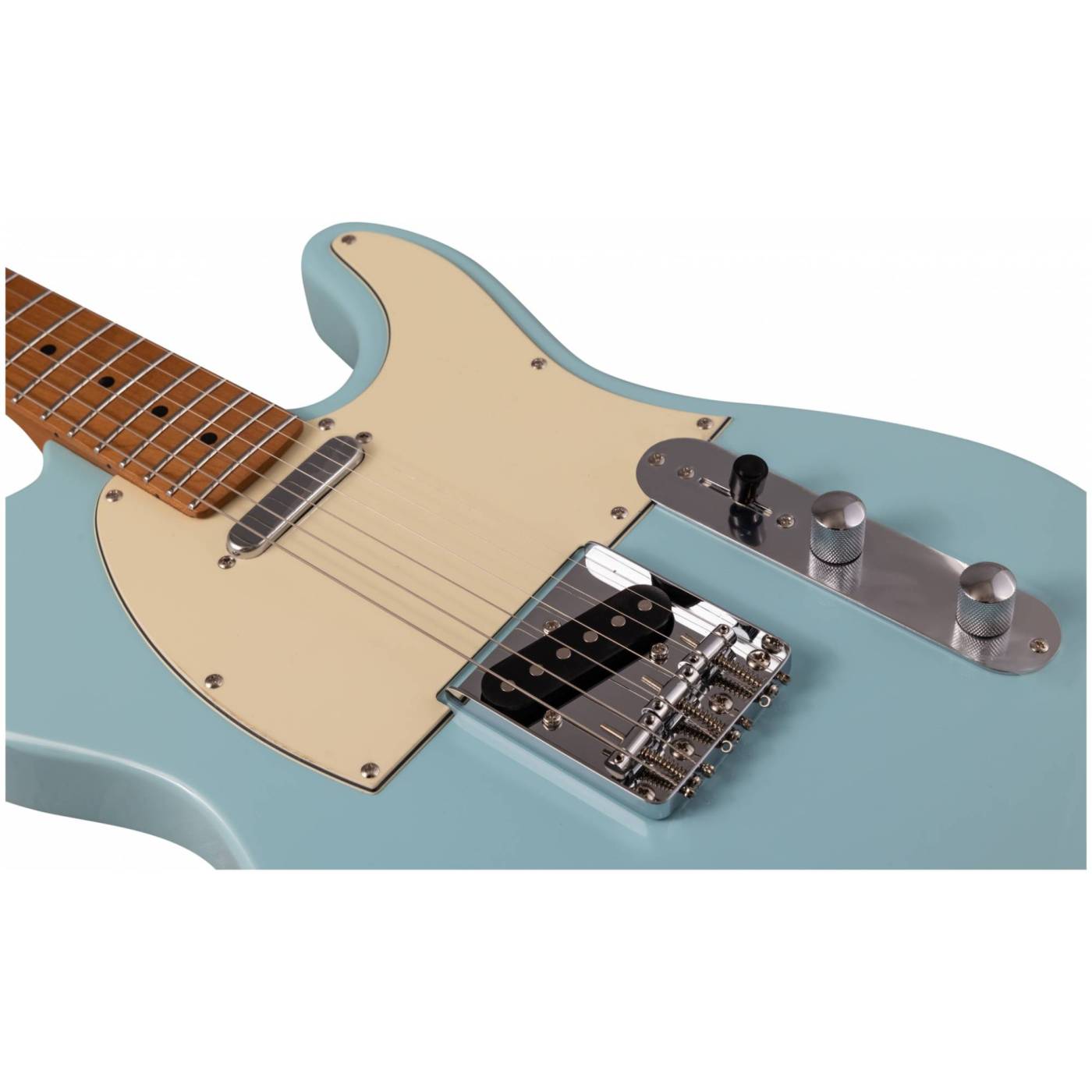 Гриф и накладка на гриф выполнены из печеного клена (roasted maple). При такой обработке поры дерева максимально сжимаются и в процессе использования вода уже не будет выходить, ваша накладка не сожмется и лады не повылазят вне зависимости от влажности и смены температуры. Плюс такое дерево выглядит очень красиво.