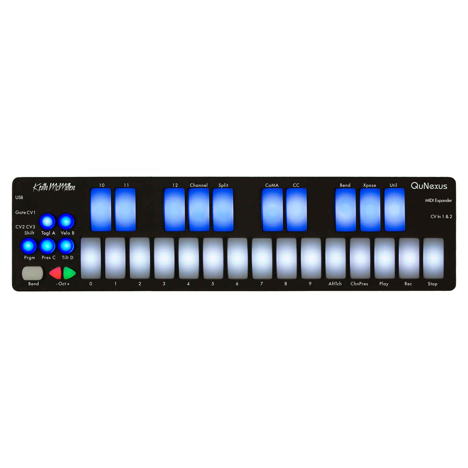 Keith McMillen QuNexus - Компьютеры и электронная аппаратура могут быть какими угодно в качестве инструментов, но Вам может понадобиться нечто другое, когда придет время играть. В этом случае Вам на помощь придет QuNexus – самый компактный, легковесный и пригодный для игры MIDI контроллер, который работает с DAW, внешними MIDI инструментами и аналоговыми синтезаторами. QuNexus значительно отличается от других клавишных контроллеров, которые Вы когда-либо видели. Это супер портативный контроллер с сенсорными пэдами для разнообразного использования. Впервые взглянув на QuNexus можно оценить его как мини пианино, сделанное из барабанных пэдов или ультра тонкая, ультра компактная плита с чувствительными к силе нажатия пэдами, устроенными виде фортепианных клавиш. Прежде всего, в QuNexus есть две вещи, которых нет в обычных клавиатурах. Во-первых, он тонкий и легкий, его можно закинуть в сумку и забыть. Во-вторых, у него чувствительные к давлению пэды, подходящие для непрерывной экспрессии, которые можно найти только на барабанных пэдах. Но QuNexus имеет преимущества по сравнению с любым барабанным контроллером на рынке. Пэды превосходного качества: они твердые на ощупь и отзывчивы на силу и скорость нажатия. Если сравнивать его с мобильной альтернативой от Akai и Korg, которые более доступны, чувствительность QuNexus намного лучше. Что касается мелодической линии, Вы здесь также получаете преимущества в удобной черно-белой раскладке клавиатуры. Плюс ко всему есть куча наворотов. Например, клавиши чувствительны к наклону, кнопки для редактирования на лету и хранения пресетов, выходы для MIDI расширения и управление напряжением. А также 16 уровневая с оттенками серого подсветка позади клавиш и цветная подсветка остальных регуляторов. Подсветка установлена по умолчанию в соответствии с Вашей игрой, но и отзывчива на сообщения, посланные через MIDI, так DIYers может разработать свое собственное световое шоу для работы с патчами. Для того чтобы пользоваться всеми этими преимуществами, QuNexus имеет необыкновенно гибкие опции входов/выходов. Вы можете подключить любой компьютер через USB MIDI без драйверов, включая все от Raspberry Pi до iPad.
