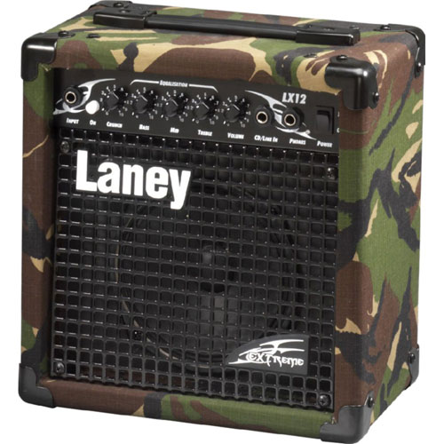 LANEY LX12 CAMO - Гитарный комбо 10 Вт, динамик 6,5" , 2 независимых канала с 3-х полосным эквалайзером и дисторшн, CD вход,вес 4,8 кг, цвет "хаки", размеры 293х282х173 мм, вес 4,8 кг.