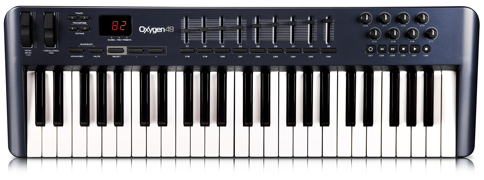 M-Audio Oxygen 49 - 4-октавная (49 клавиш) динамическая MIDI клавиатура USB , 8 программируемых ползунковых регуляторов и 8 регуляторов радиального типа, 3-сегментный LED дисплей, управление транспортом.