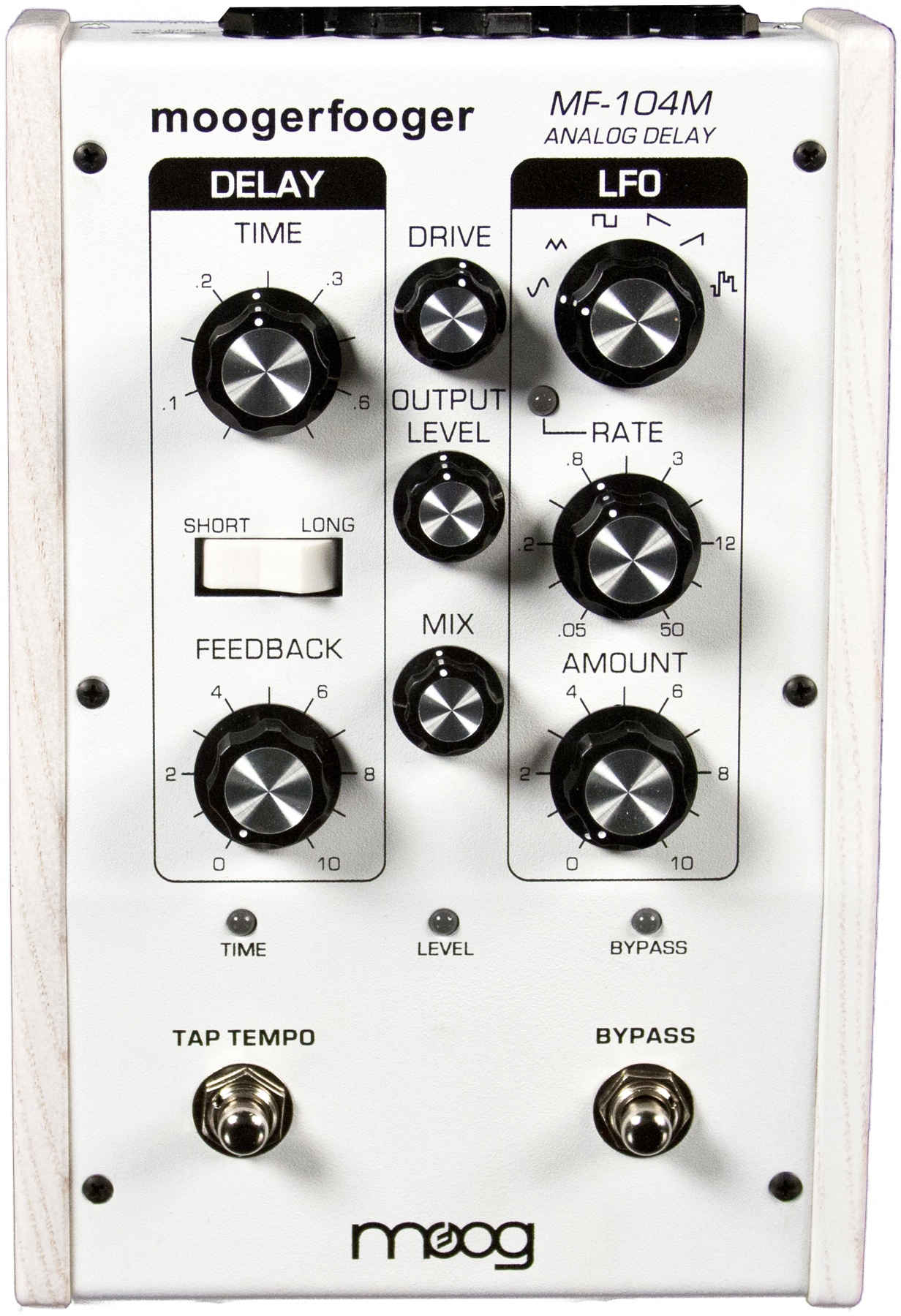 Moog MF-104M Analog Delay Wht - Аналоговый дилэй, контроль времени задержки: short 40-400 мс, long 80-800 мс, контроль обратной связи, контроль формы волны 6 форм LFO для модуляции задержки, контроль частоты LFO 0.05-50 Гц, контроль величины LFO модуляции времени задержки, белый.