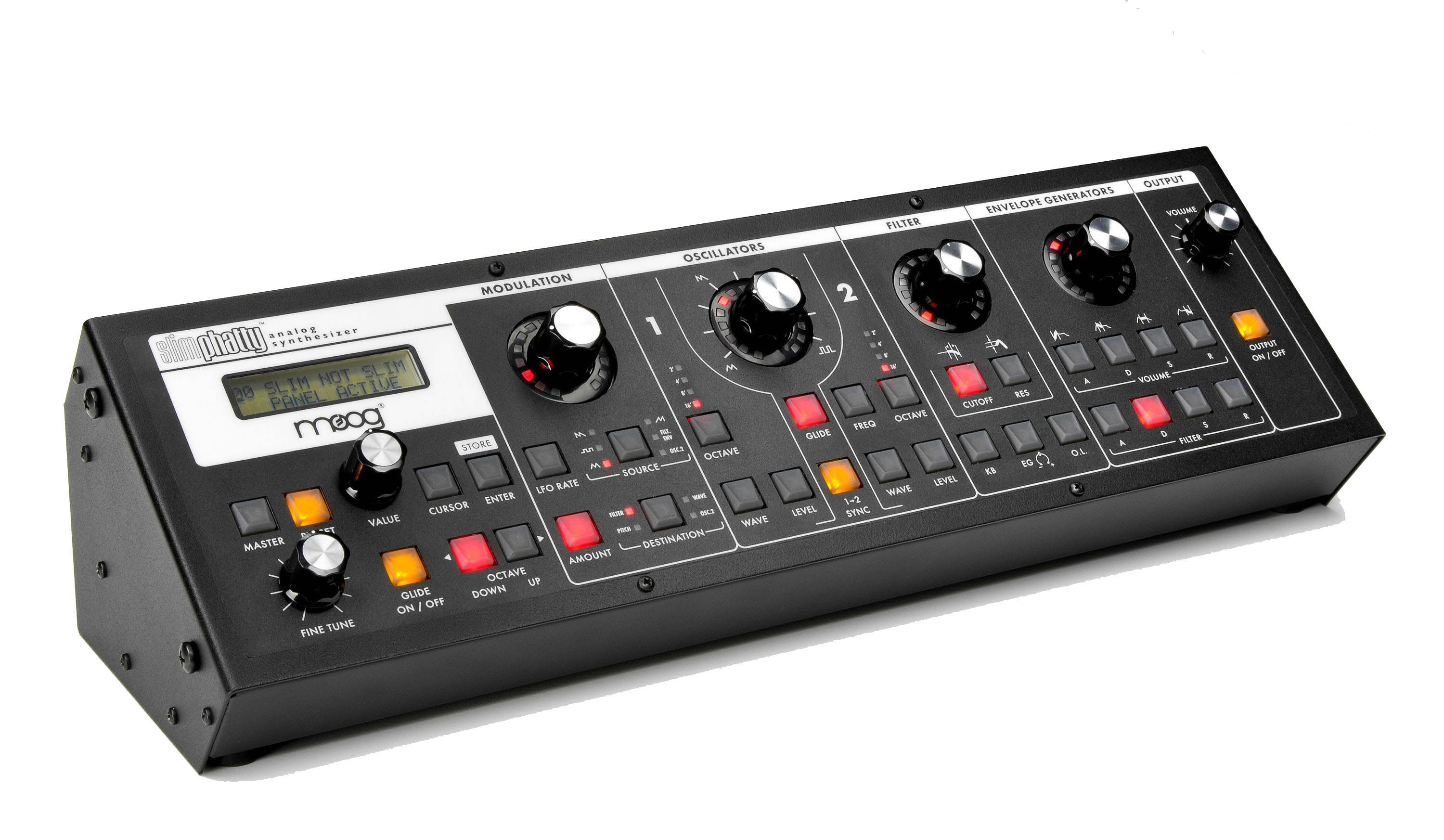 Moog Slim Phatty - Монофонический аналоговый синтезатор со 100% аналоговым трактом сигнала, рэковый модуль, LCD дисплей, 2 ADSR генератора огибающей, 2 VC осциллятора, LFO осциллятор, VCLP фильтр, Moog Ladder фильтр, арпеджиатор, MIDI over USB, MIDI Clock Sync, Tap Tempo, MIDI In/Out/Thru, USB