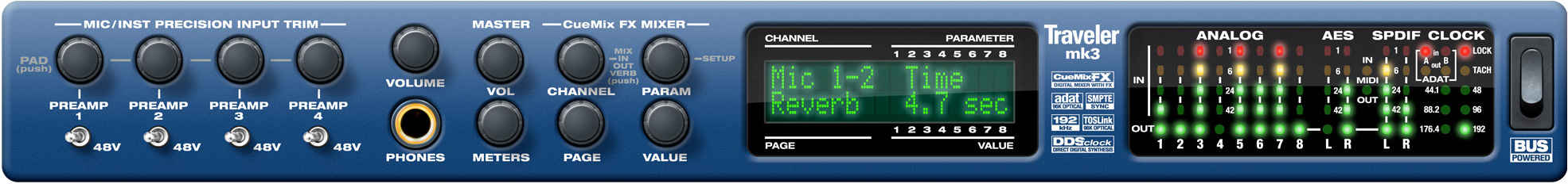 Управление с помощью передней панели – доступ к любым настройкам микса устройства Traveler-mk3 на передней панели.