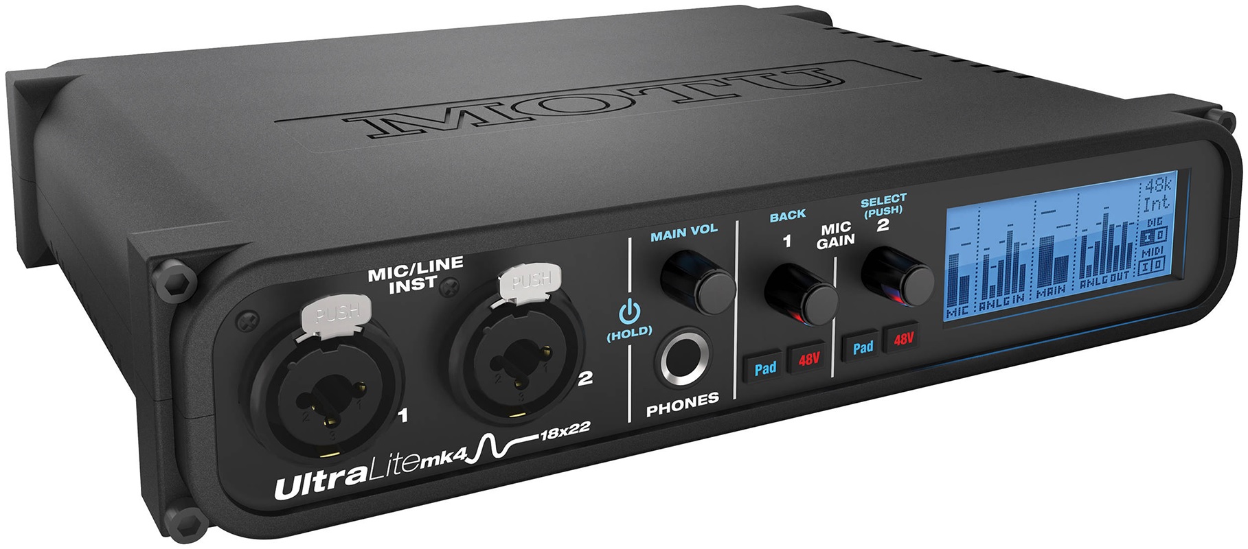 MOTU UltraLite mk4 располагает 6-ю аналоговыми линейными входами, 2-мя микрофонными/инструментальными комбовходами, 10-ю линейными выходами и одним стереофоническим выходом на наушники. Что касается цифровых интерфейсов, то тут есть восьмиканальные оптические вход и выход ADAT/SMUX и двухканальные коаксиальные вход и выход формата S/PDIF. Нельзя не отметить и наличие входа и выхода MIDI, обеспечивающих возможность подключения к UltraLite-mk4 различных контроллеров и модулей.