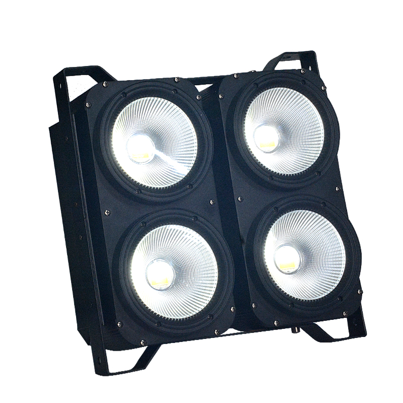 MVT BL4100 - Ультра яркий 2x2 блайндер с четырьмя COB светодиодами 2в1 (белый и теплый белый) мощностью по 100 Ватт, каждый из которых управляется индивидуально (функция pixel mapping control). Прибор распространяет тёплый белый свет с суммарным потоком более 19 000 люмен. Светильник имеет широкий угол — 75°, а среди эффектов доступны импульсные, мгновенное открытие и плавное диммирование, а также строб. Для контроля устройством доступны 2 режима DMX: 4, 12 каналов. Режимы управления: DMX512, звуковая активация, мастер-ведомый, авто. Цветовая темература: 3200~6500K. 2 мощных струбцины для крепления прибора к перекладине или ферме. Версия для использования только внутри помещения.