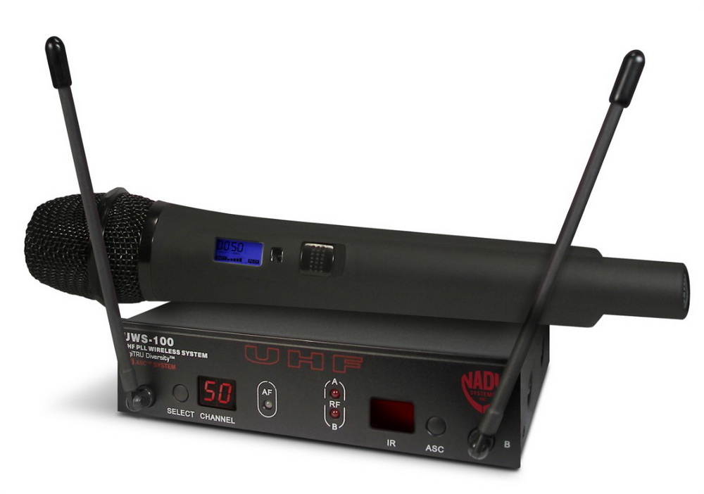 Nady UWS-100 HT - UHF радио-микрофонная система, DigiTRU Diversity PLL, 100 каналов, 1 ручной передатчик UHT-100 с динамическим микрофоном DM-10D, 1 приемник UWS-100, 2 антенны, диапазон частот 30-21000 Гц, динамический диапазон 120 дБ, THD <0.5%, рабочая зона 75-150 м, балансные XLR и 1/4" TS Jack аудио выходы, питание: передатчик 2хбатареи АА, приемник AC/DC 15 В, 0.4 А