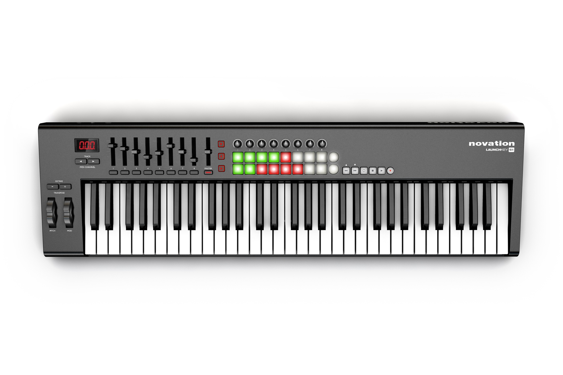 Launchkey модели доступны с 61-нотной, чувствительной к скорости клавиатурой. Все модели снабжены 16 пэдами, двумя кнопками управления Launchpad и восьмью поворотными регуляторами. Устройства также имеют 3-значный светодиодный дисплей, контроль транспорта, колеса питча и модуляции, вход для педали сустейна и многое другое. Launchkey 61 имеет девять фейдеров, с подсвечивающейся кнопкой режима и восемь MUTE / SOLO кнопок. В дополнение к программному обеспечению для Mac и PC, Launchkey объединяет два мощных приложения iPad. Приложение Launchkey синтезатор работает на iPad 2 или более поздней версии и использует технологию Novation synt в новом интуитивно понятном сенсорном интерфейсе. Приложение позволяет управлять несколькими параметрами синтезатора для создания уникальных эффектов.Launchpad приложение использует аппаратные кнопки для запуска петель и эффектов, включая заикание и синхронизированные фильтр-эффекты. Launchkey подключается к вашему iPad с использованием стандартного комплекта подключения камеры (не входит в комплект) - это позволит вам контролировать свои музыкальные приложения.