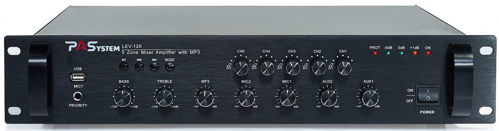 PASystem LEV-120 - трансляционный Микшер-усилитель с МП3-проигрывателем. Данный усилитель предназначен для организации качественной трансляции фоновой музыки и речевого оповещения на объектах общественного, торгового и промышленного назначения. Данная серия имеет качественное музыкальное звучание и высокую читаемость воспроизводимой речи.