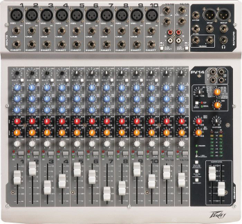 Компактный микшер PV 14 обладает множеством полезных и удобных особенностей. Превосходные микрофонные предусилители с невероятно низким (0.0007%) коэффициентом нелинейных искажений (THD) позволяют использовать этот микшер, как для живого звука, так и в небольших студиях. На всех двенадцати каналах (10 микрофонных и 2 линейных) имеются регулировки посыла на эффекты, на монитор и 3-х полосный эквалайзер. На каналах 1-10 предусмотрены разъёмы Insert. Мастер-секция включает в себя фантомное питание 48 В, встроенный блок эффектов, посыл и возврат, вход Tape и Contour- эквалайзер. Входные разъёмы выполнены на XLR и 1/4" "джеках", а современный дизайн металлического корпуса делает PV 14 непохожим на остальные пульты в своём классе.