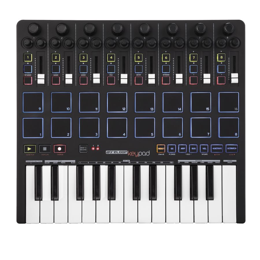 USB MIDI контроллер Keypad оборудован 25 чувствительными к скорости нажатия клавишами, 8 фейдерами, 16 поворотными ручками и 8 энкодерами с назначенными функциями. Этот уникальный контроллер поможет Вам создавать комплекс композиций на лету. Благодаря встроенному арпеджиатору Вы можете построить живой цикл с гибкой квантизацией, сто добавит тонкий нюанс вашему звуку, а режим аккордов дает различные комбинации всего одним нажатием одной клавиши. 16 чувствительных к скорости нажатия и с подсветкой барабанных пэдов помогают быстро создавать барабанные циклы или могут использоваться для различных программ и смены режимов или активации плагинов. В комплект поставки входит программное обеспечение Ableton Live Lite 9.-