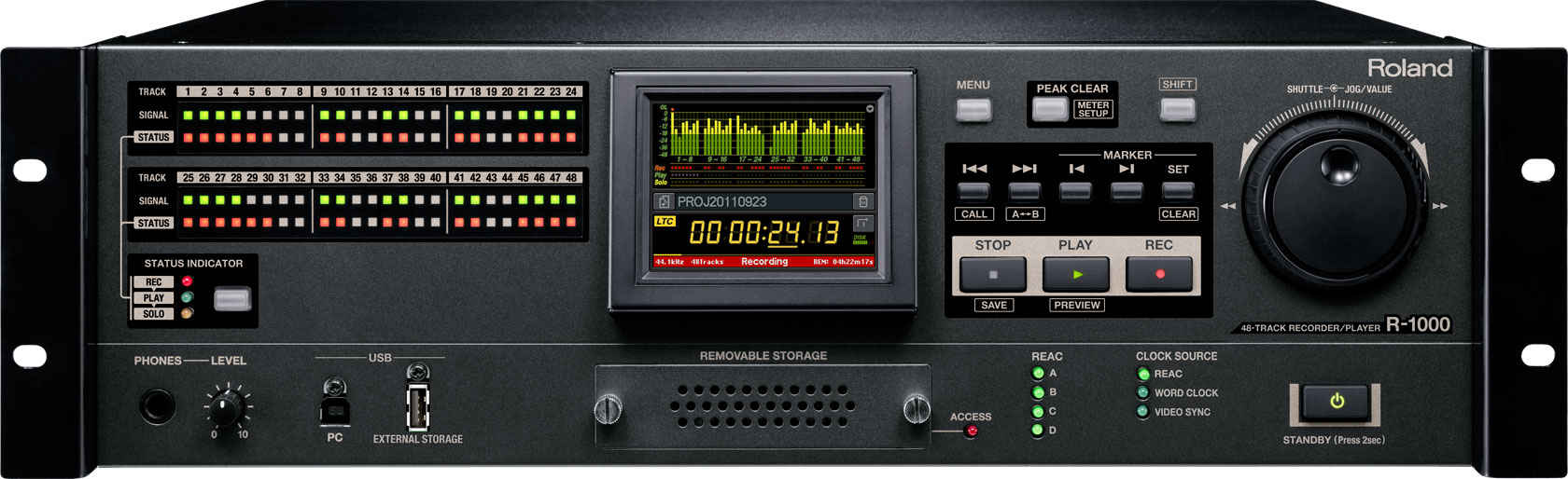 Roland R-1000 - интуитивно управляемый автономный рекордер/плеер, предназначенный для работы в составе любых систем V-Mixing. Кроме того, ч помощью Roland S-MADI REAC MADI Bridge можно скоммутировать R-1000 с любой цифровой консолью, имеющей выходной интерфейс MADI.