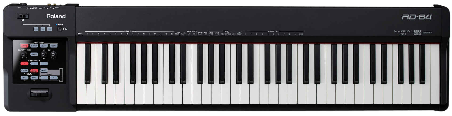 ROLAND RD-64 имеет 64-клавишную клавиатуру Ivory Feel-G, которая включает самую совершенную сенсорную технологию, механизм Escapement, и отделку под слоновую кость. Это дает отличные ощущения, музыкальную отзывчивость, как и на старших 88-клавишных моделях, а уникальное покрытие напоминает настоящую слоновую кость и черное дерево, которое также впитывает влагу. Вместе со звуковым генератором SuperNATURAL клавиатура Ivory Feel-G предлагает выразительность и отдачу, которые могут поспорить с гораздо более дорогими инструментами.