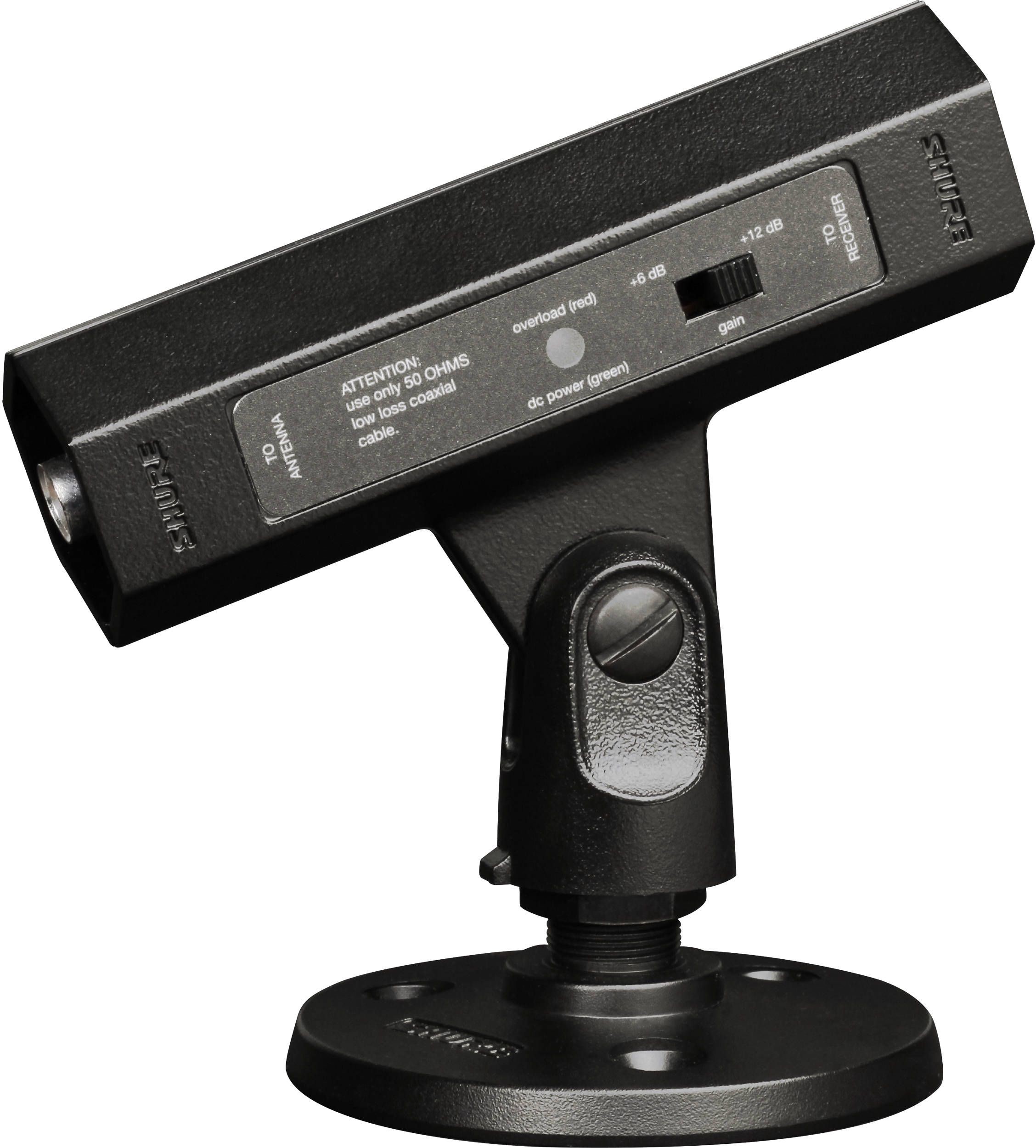 Усилитель имеет двухпозиционный переключатель на +6 и +12 дБ, светодиодные индикаторы перегрузки и совместим с системами распределения антенны Shure UA845 и UA844. Кроме того, интегрированный адаптер с резьбой легко подключает усилитель к микрофонной стойке, и она включает в себя кронштейн для поверхностного монтажа.