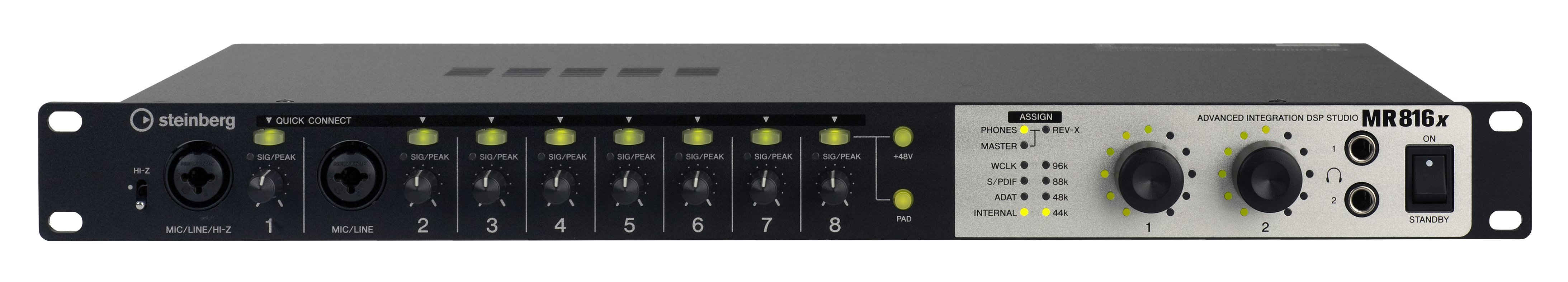 Steinberg MR816X - Интегрированная DSP студия, включающая FireWire аудио интерфейс, 8 микр. преампов, 8 бал. анал. XLR/TRS входов, 8 бал. анал. TRS выходов, ADAT вход/выход, Coax S/PDIF вход/выход, 2 вых. на наушники с инд. контр. уровня, 2 Insert FX, WordClock.