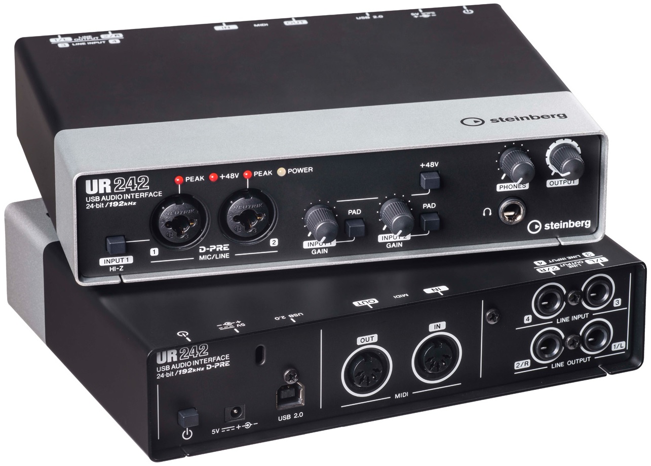 STEINBERG UR242 - имеет четыре аналоговых входа и пару выходов, а главными достоинствами устройства является наличие микрофонных предусилителей D-Pre и DSP-чипа SSP2 от Yamaha. Как утверждает производитель, интерфейс Steinberg UR242, предназначенный для музыкантов и продюсеров, имеет выдающееся для своей ценовой категории качество звучания и высокое качество сборки.