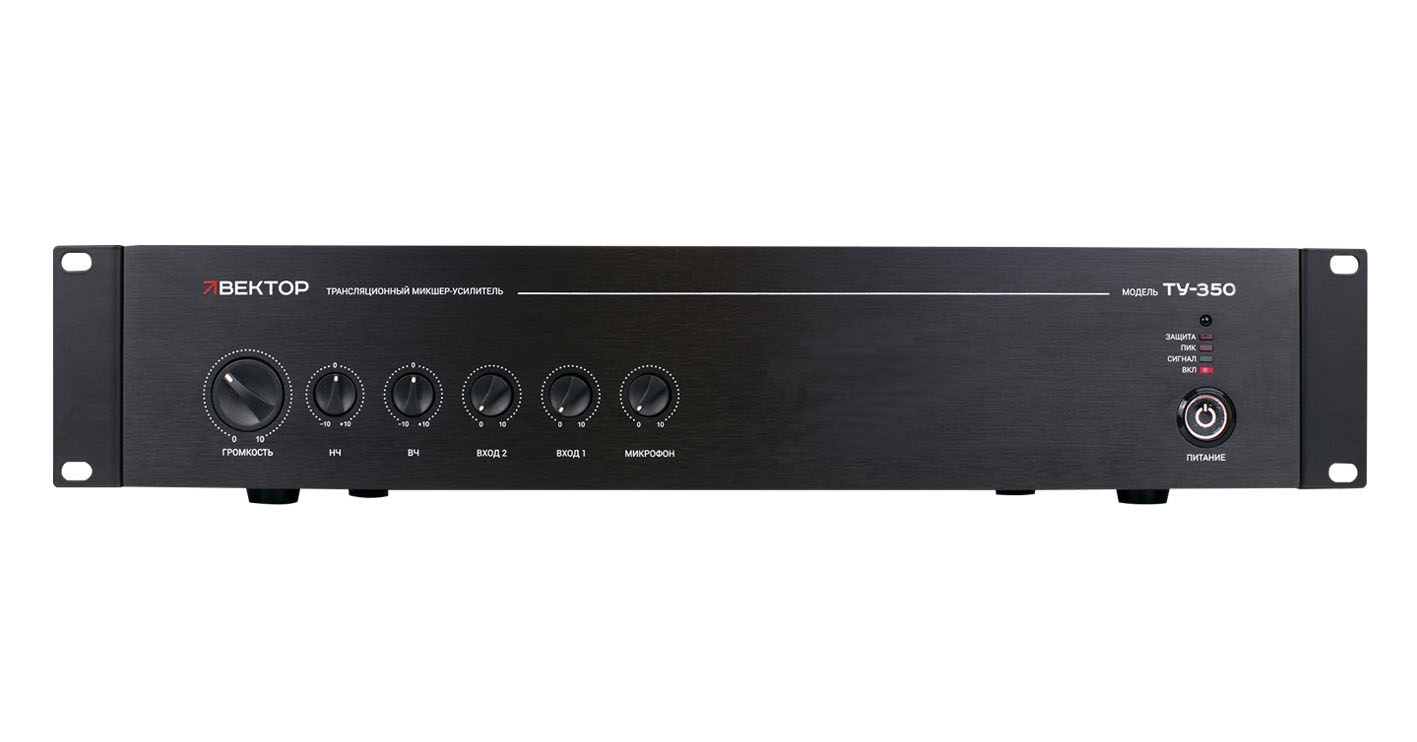 ВЕКТОР ТУ-350 - Компактный микшер-усилитель. Мощность 350Вт. Выход 100В\4-16Ом, 1 микр и 2 AUX входа, 1 AUX выход. Питание 220В. Рэковое крепление в комплекте. Размеры 430 х 88 х 365 мм. Вес 16 кг.