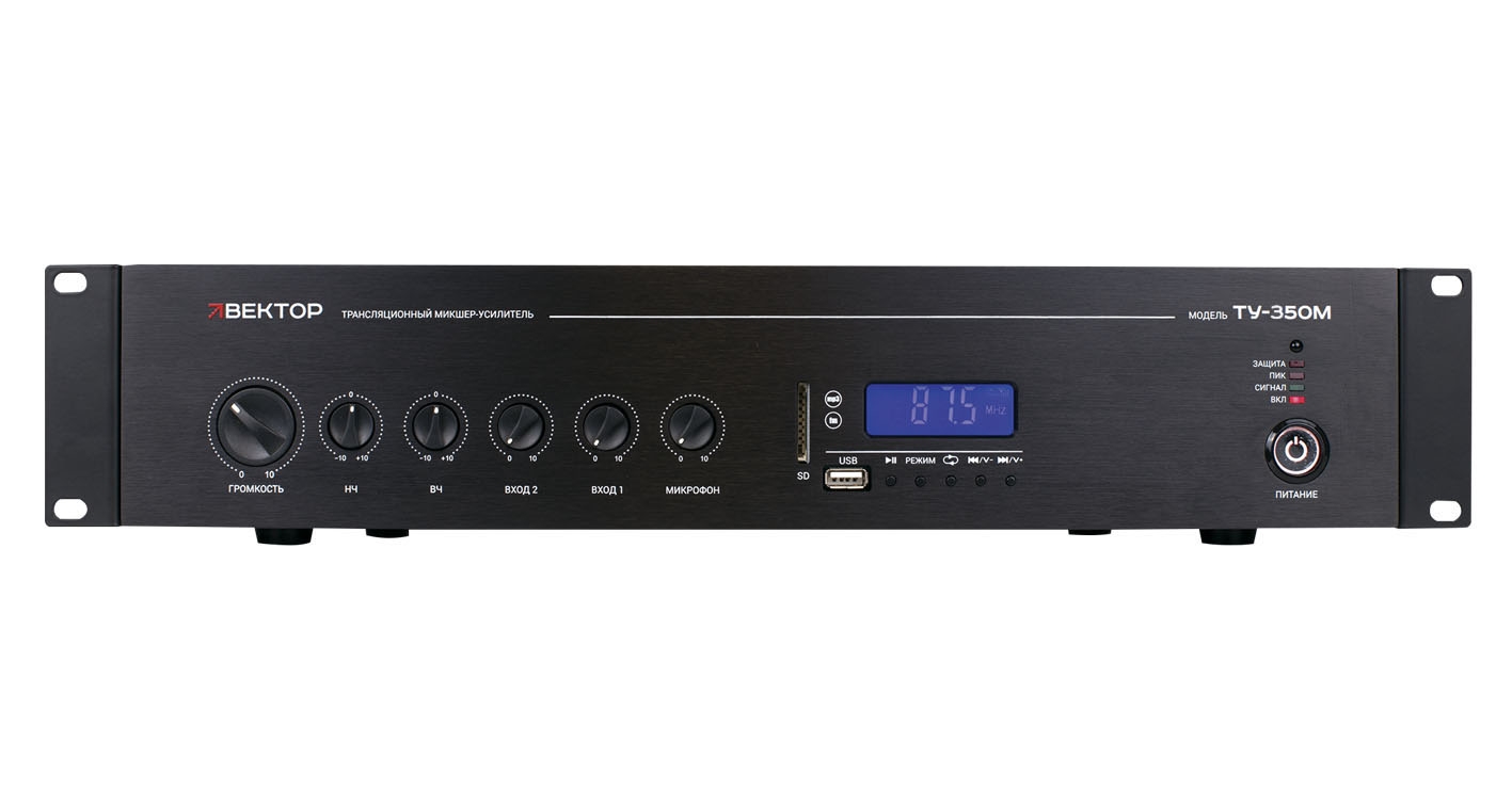 ВЕКТОР ТУ-350М - Компактный комбинированный микшер-усилитель. Мощность 350Вт. Выход 100В\4-16Ом, 1 микр и 2 AUX входа, 1 AUX выход. Цифровой FM тюнер, MP3 плеер, USB, SD, Bluetooth. Питание 220В. Рэковое крепление в комплекте. Размеры 430 х 88 х 365 мм. Вес 16 кг.