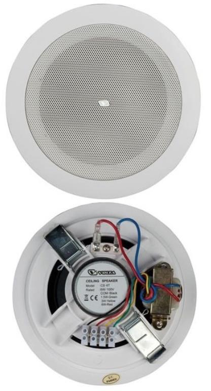VOLTA CS-6FT - Потолочный громкоговоритель с огнезащитным колпаком. Используется в системах аварийного оповещения и музыкальной трансляции. Номинальная мощность составляет 6 Вт. Отводы трансформатора 6 Вт - 3 Вт - 1,5 Вт. Корпус выполнен из пластика, колпак - из металла в белом цвете.