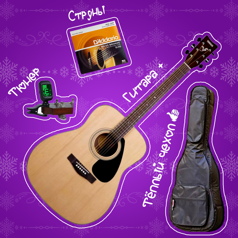 Новогодний комплект: акустическая гитара, утепленный чехол, тюнер для настройки гитары, качественные струны D'Addario (калибр на выбор 9-10-11)