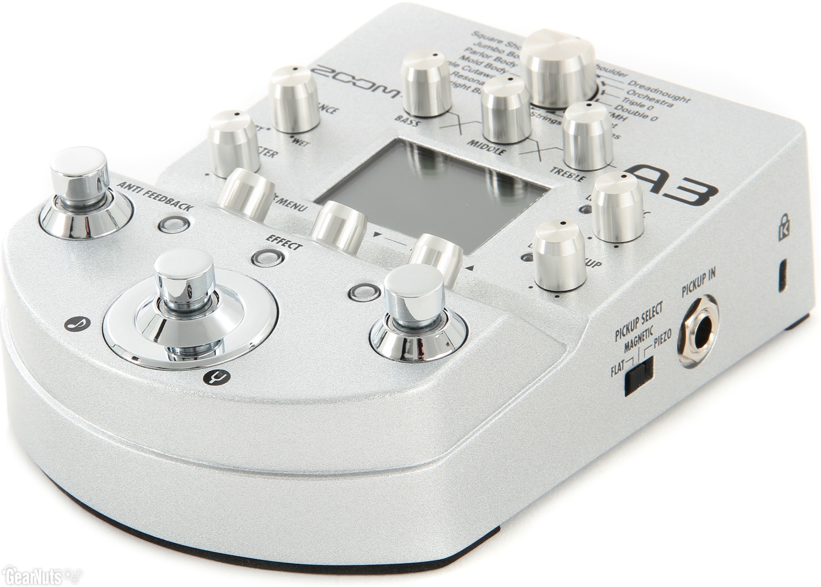 Гитарный процессор Zoom A3 оснащен двумя 1/4-дюймовыми выходомами и 1/4-дюймовым монофоническим разъемом для звукоснимателей. Рядом находится переключатель, который позволяет сделать выбор между тремя режимами: Flat, Magnetic или Piezo. В режиме Magnetic немного сильнее звучат басы, в то время как режим Piezo позволяет сделать акцент на верхах. Входной импеданс имеет постоянное значение в 1 МОм.
