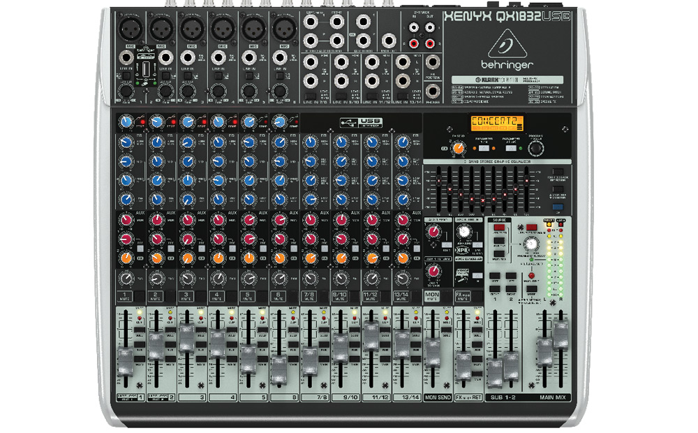 QX1832USB имеет две дополнительных микрофонных полосы для шести XENYX микрофонных предусилителей. Благодаря встроенному ULM приемнику есть возможность подключения беспроводных микрофонов. Встроенный 9-полосный графический эквалайзер предоставляет роскошную систему эквалайзеров и работает вместе с FBQ обратной связью для обнаружения и устранения визга микрофона. Другими характеристиками являются полноразмерные фейдеры для Mon и FX посыла и дополнительный Aux посыл для общих трех и двух адрессуемых подгрупп.