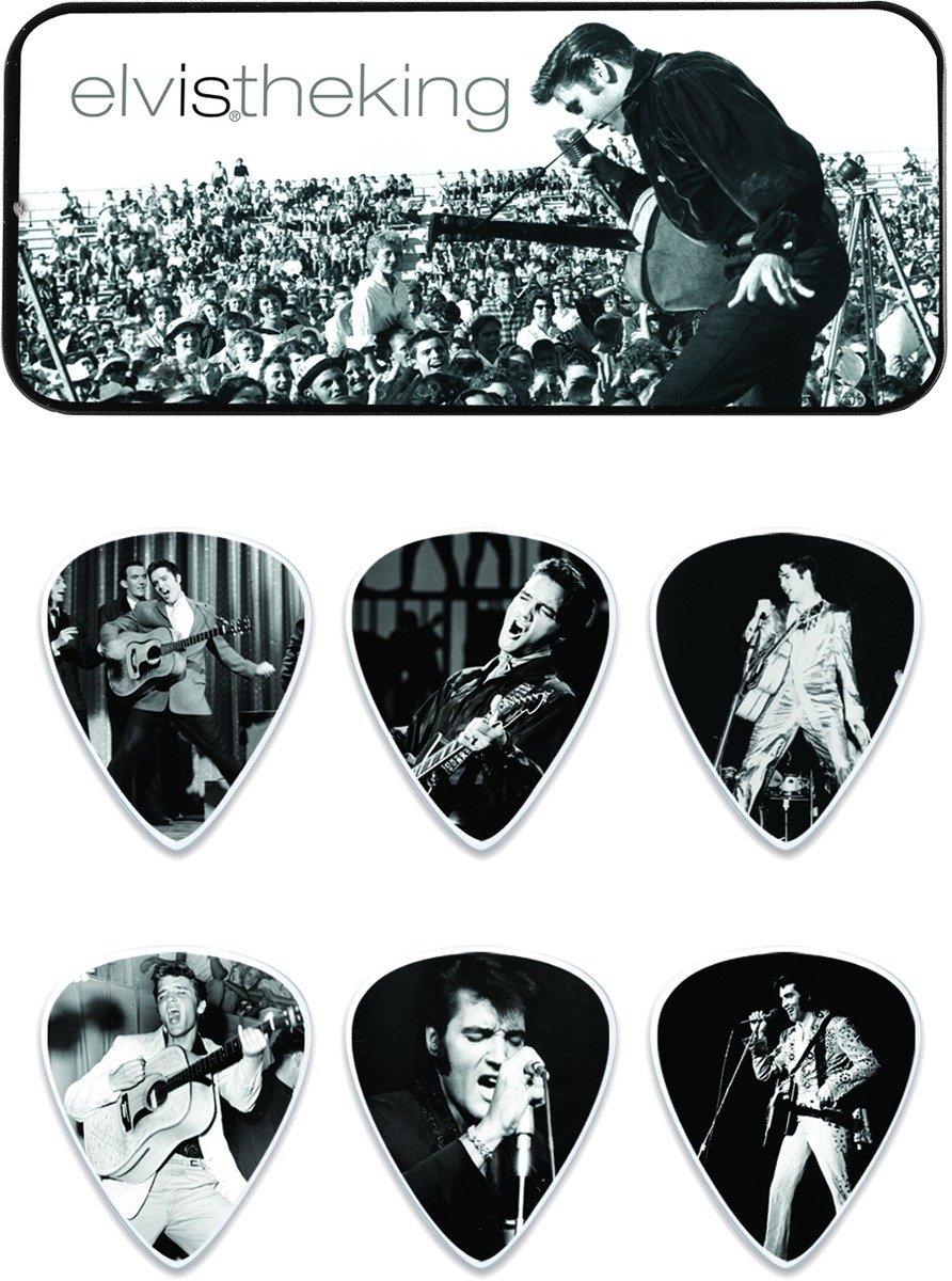 Dunlop с городостью представляет медиаторы от самого короля рок-н-ролла, Элвиса Пресли. Каждая из коллекционных жестяных коробочек содержит шесть гитарных медиаторов с изображениями с различных стадий жизни Короля. Жестяная многоразовая коробочка украшена рисунком из той же серии.