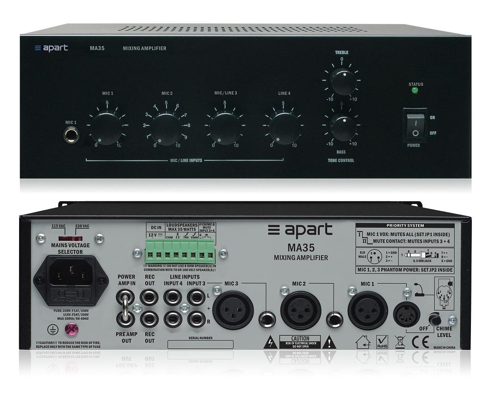 APart MA35 - компактный трансляционный усилитель мощность 35 Вт, выход в трансляционную линию 100/70В, предусмотрен также выход 8Ом для подключения низкоомных громкоговорителей. Встроенный генератор сигнала "ГОНГ" (запускается при активации микрофона, отключаемая функция). Усилитель имеет 2 микрофонных входа, 1 микрофонный/линейный вход, 1 линейный вход, линейный выход на устройство записи или на дополнительный усилитель, выход предварительного и вход оконечного усилителя (последние соединены снимаемой перемычкой) Для первого микрофонного входа можно установить функцию приоритета. Возможно включение фантомного питания микрофонов (на плате в корпусе усилителя). Уровень всех входных сигналов регулируется на передней панели устройства. Предусмотрены регуляторы низких и высоких частот. Питание усилителя 220В АС и 12 В DC. К усилителю опционально поставляются крепления для установки в аппаратный шкаф или стойку 19".
