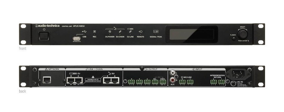 Audio-Technica ATUC-50CU - это контрольное устройство для комплексной конференц-системы ATUC-50. Оно позволяет управлять 50 конференц-микрофонами, каскадное подключение до 150 конференц-микрофонов также позволяет управлять ими (ATUC-50DU + ATUC-M). Последовательное или параллельное подключение можно выполнить при помощи Cat5e или более высокой категории (производитель рекомендует использовать экранированные кабели с диаметром жил 24AWG или более). У устройства четыре настраиваемых симметричных матричных выхода и один несимметричный выход, из которого выводится такой же звуковой сигнал, что и с выхода 1. Есть 2 входа Mic/Line, 2 монофонических входа AUX и 2 возврата: оба канала возвратов доступны для двуязычного синхронного перевода и для языка выступающего. Режимов конференции у модуля три: свободное включение, по запросу и дистанционное. Режим приоритета можно менять с приоритета первого нажатия на приоритет самого позднего нажатия (FIFO, LIFO). Наконец, у микрофона также есть режимы включения: ручной режим и голосовой.