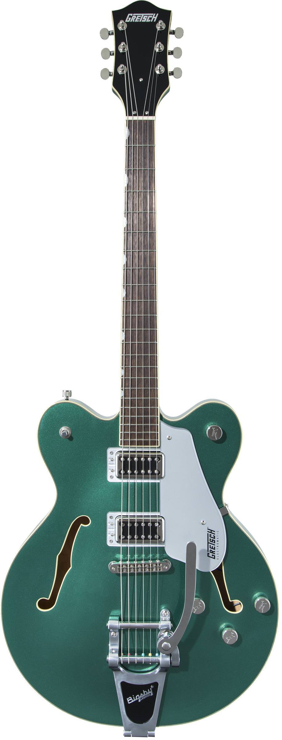 GRETSCH GUITARS G5622T EMTC CB DC GRG - электрогитара с полым корпусом из линейки Electromatic® Center Block. Это классическая модель Gretsch с узнаваемым звуком и традиционным дизайном. Звучание инструмента – мощное, динамичное, очень чистое, с великолепной артикуляцией. Гитара заключена в корпус с двумя вырезами, выполненный из ламинированного клена. Конструкция корпуса с центральным ребром из еловой древесины, укрепляющим верхнюю деку гитары и позволяющим избежать нежелательной обратной связи при игре на высокой громкости, а также отверстия формы «f» в верхней деке обеспечивают прекрасный резонанс. Гриф – кленовый, с глянцевой уретановой отделкой, накладкой из лавра. Мензура – 625 мм (24.6 дюйма). На грифе 22 лада Medium Jumbo с оригинальной перламутровой инкрустацией «Thumbnail» по краю. Звукосниматели – два хамбакера собственной разработки Blacktop™ Broad’Tron™. Переключатель – 3-позиционный. В дополнение к регуляторам тембра и общего уровня громкости предусмотрены отдельные регуляторы громкости для каждого из звукоснимателей. Бридж Anchored Adjusto-matic™ обеспечивает стабильность строя, а тремоло Bigsby® B70 даёт широкие возможности для экспрессивной игры. Модель представлена в зеленом цвете с черной головой грифа, регуляторами формы G-Arrow, никелированной фурнитурой.