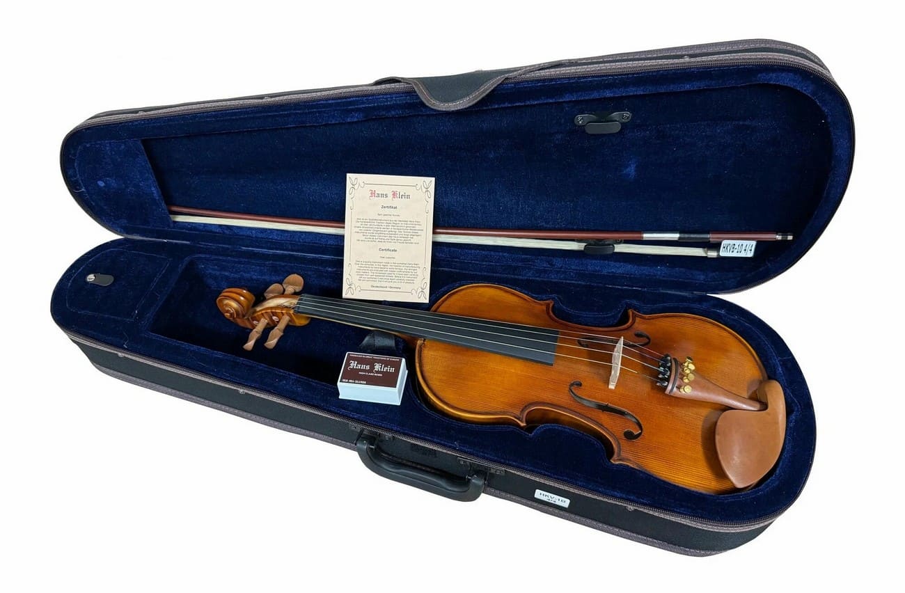 Комплект - КЕЙС + СМЫЧОК + КАНИФОЛЬ, верхняя дека - резонансная германская ель, нижняя дека и обечайки - волнистый клён, фурнитура - BOXWOOD, струнодержатель с 4-мя машинками микроподстройки, покрытие - матовый лак