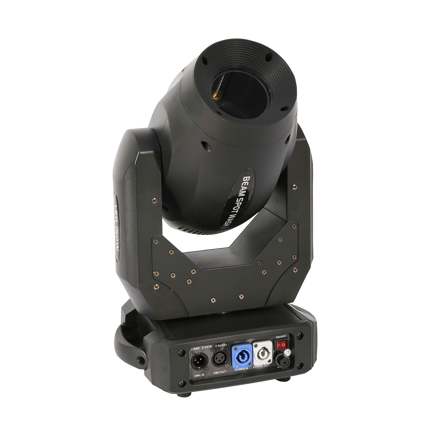 MVT MH150 - Компактная вращающаяся "голова" типа Beam Wash и Spot (3в1), zoom 3-27 градусов, белый светодиод 150 Вт, радужные цветовые эффекты, 7 дихроичных световых фильтра, 6 вращающихся стеклянных и 10 статичных металлических гобо, 3-гранные линейные независимые вращающиеся призмы, высокоскоростной затвор и стробоскоп, полноцветный обратимый на 180° ЖК-дисплей дисплей меню и универсальный многоканальный автоматический источник питания с напряжением 100-240В.Движение: PAN: 540° (16 бит), TILT: 270° (16 бит). Разъемы: 2 x 3pin DMX (IN/Out), сетевые вилка и розетка PowerCON. Комплектация: Сигнальный кабель-переходник длиной 1м 3pinDMX (папа) <-> 3pinDMX (мама); Сетевой кабель-переходник PowerCON-PowerCON длиной 1м, Страховочный тросик; 2 мощных струбцины.