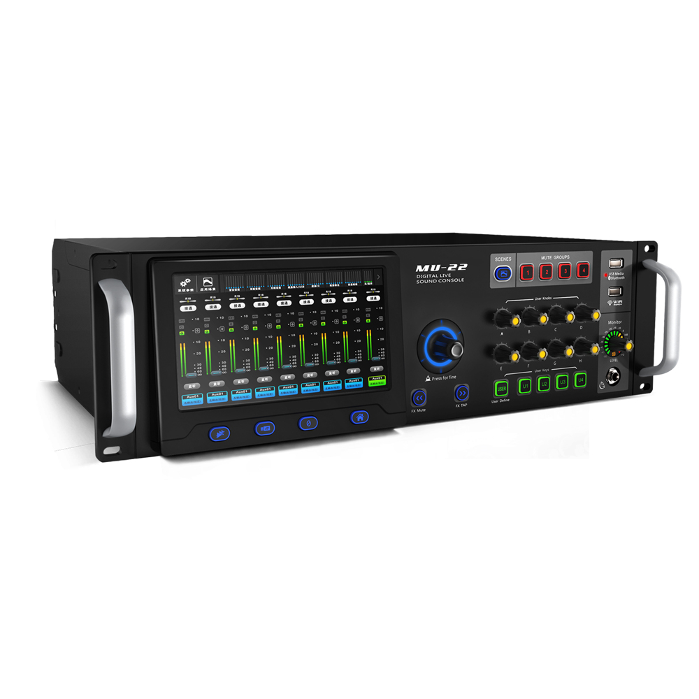 MVT MU-22 - Цифровой микшерный пульт для "живых" выступлений в рэковом исполнении. 22 входных канала, 18 выходов. Все входы Mic/Line (16 шт) имнют 48В фантомное питание, переключение фазы, Шумоподавтель (Gate), Компрессор (Comp), 4-х полосный параметрический эквалайзер (PEQ) / в т. ч. полочные фильтры ВЧ (HSF) и НЧ (LSF), фильтры HPF и LPF. Все выходы имеют Delay, Компрессор (Comp), графический частотный эквалайзер (GEQ), 4-полосный параметрический эквалайзер (PEQ). 4 профессиональных DSP-процессора эффектов (FX), 6 типов эффектов: Chorus, Echo, Flanger, Pitch-Shift, Reverb, ping-pong (Stereo Delay), всего более ста пресетов эффектов. 8 групп DCA и 43 группы MUTE. Воспроизведение с USB-носителя, файлов формата MP3, AAC, WAV, AIFF, APE или FLAC. Прямая запись на USB-диск, не нужно подключаться к внешнему компьютеру.